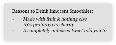 Less text means sticking to the point, and that can often be challenging. You have no idea whether the readers can get the message or not. This is where you need to be tricky about it, as well as creative. Here’s an example of the product Innocent Drinks: